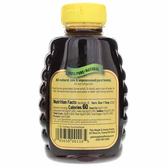 All Natural Honey - Buckwheat from Patz Maple & Honey Farms is made from unprocessed honey gathered from bees who visit buckwheat flowers. The honey from these bees has a distinct dark color. The color of honey is believed to affect its taste, with dark colors having a bold flavor.