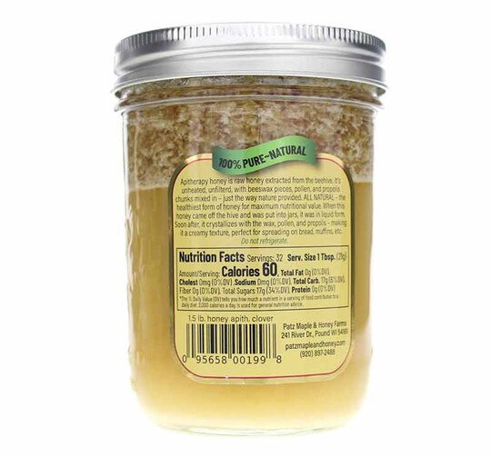 Patz Maple & Honey Farms Apitherapy Clover Honey combines raw, unfiltered honey with propolis, beeswax, and pollen to provide a full spectrum of honey nutrients. This hive-sourced honey contains compounds that support immunity, energy, and wellness. The formula offers a creamy, rich texture suitable for spreading on bread, muffins, and other foods.