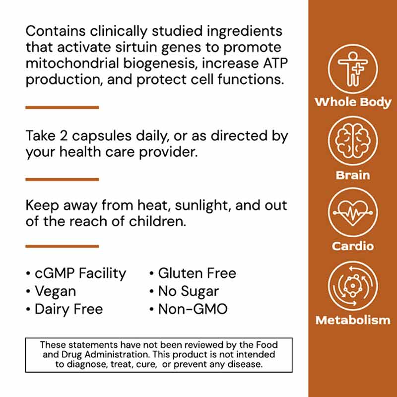Contains clinically studied ingredients that activate sirtuin genes to promote mitochondrial biogenesis, increase ATP production, and protect cell function. This supplement promotes metabolism and cardio health while supporting the brain and the entire body.