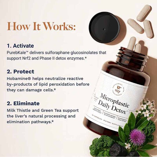 Chronic exposure to microplastics and other toxins can place stress on the body and affect healthy inflammatory balance. Microplastic Daily Detox is formulated to support the body's natural defenses with Hobamine™, a researched phytochemical found in Himalayan tartary buckwheat that helps neutralize oxidative byproducts. It also features green tea extract, rich in EGCG, to support healthy inflammation markers. Utzy also includes milk thistle to promote overall liver health and detoxification.*