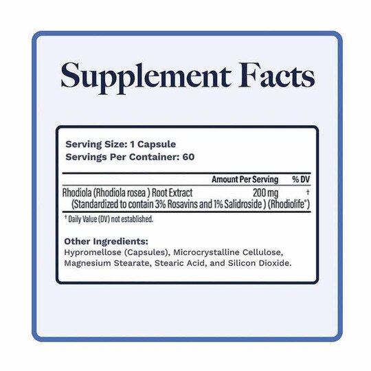 - Rhodiola (Rhodiola rosea) Root Extract (Standardized to contain 3% Rosavins and 1% Salidroside) (Rhodiolife®)- 200 mg (†)