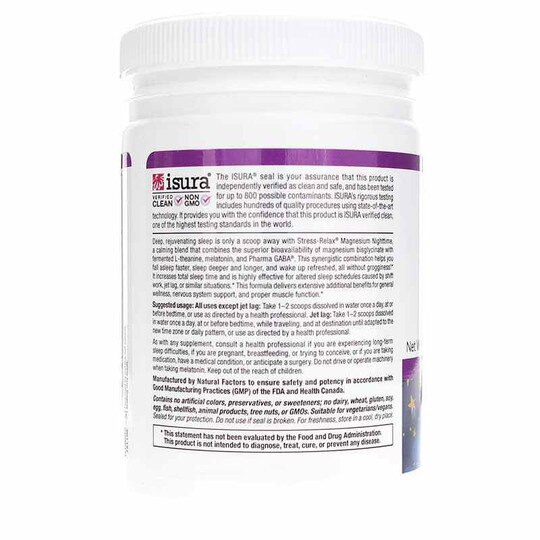 Stress-Relax Nighttime Magnesium Bisglycinate from Natural Factors is a calming blend that combines superior bioavailability of magnesium bisglycinate with melatonin, L-theanine, and Pharma GABA to help you fall asleep faster, sleep deeper and longer, and wake up refreshed, all without grogginess. It increases total sleep time and is highly beneficial for altered sleep schedules caused by shift work, jet lag or similar situations. This formula delivers extensive additional benefits for general wellness, nervous system support and proper muscle function.