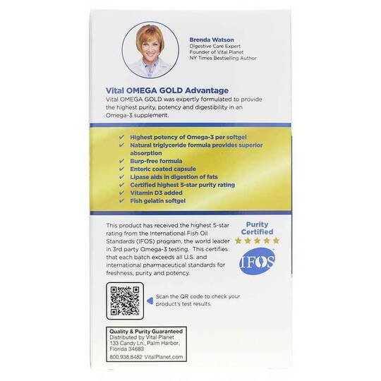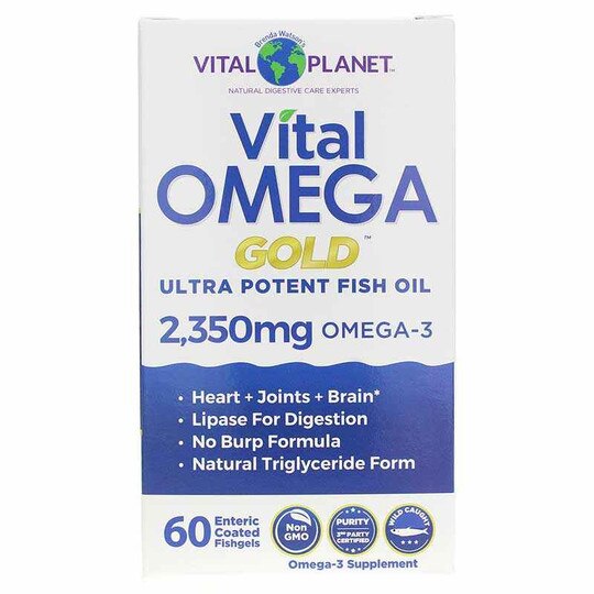 Vital Omega Gold Ultra Potent Fish Oil from Vital Planet supports heart, joints and brain health as well as healthy digestion. It is part of the exclusive Brenda Watson H.O.P.E. Formula for Optimum and Vibrant Health. The H.O.P.E Formula recommends a minimum of 2,000mg of Omega-3 oil daily and Vital Omega Gold delivers this and more!